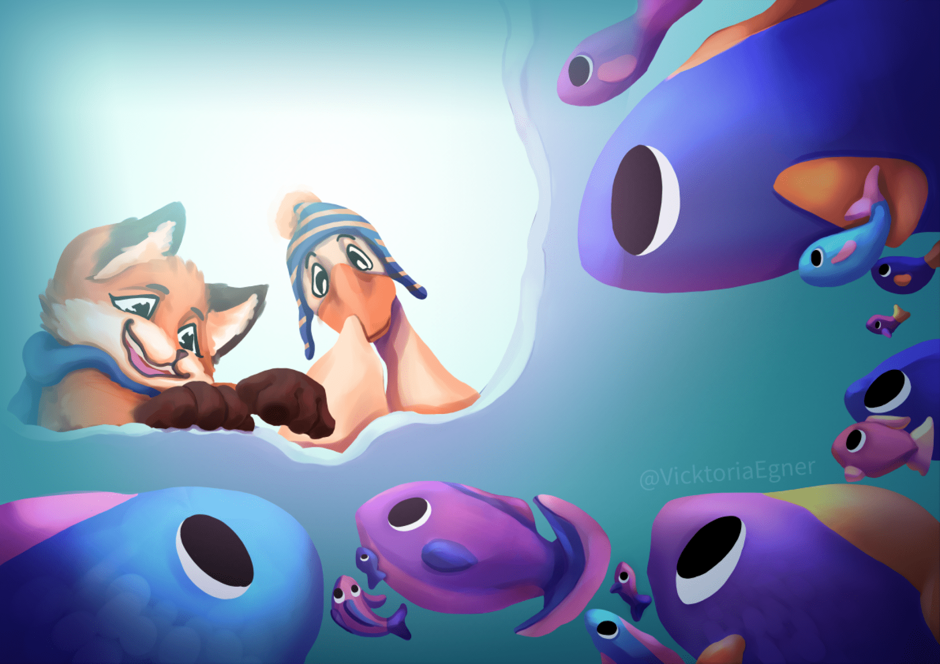 fox and goose fishing in winter. illustration for the book