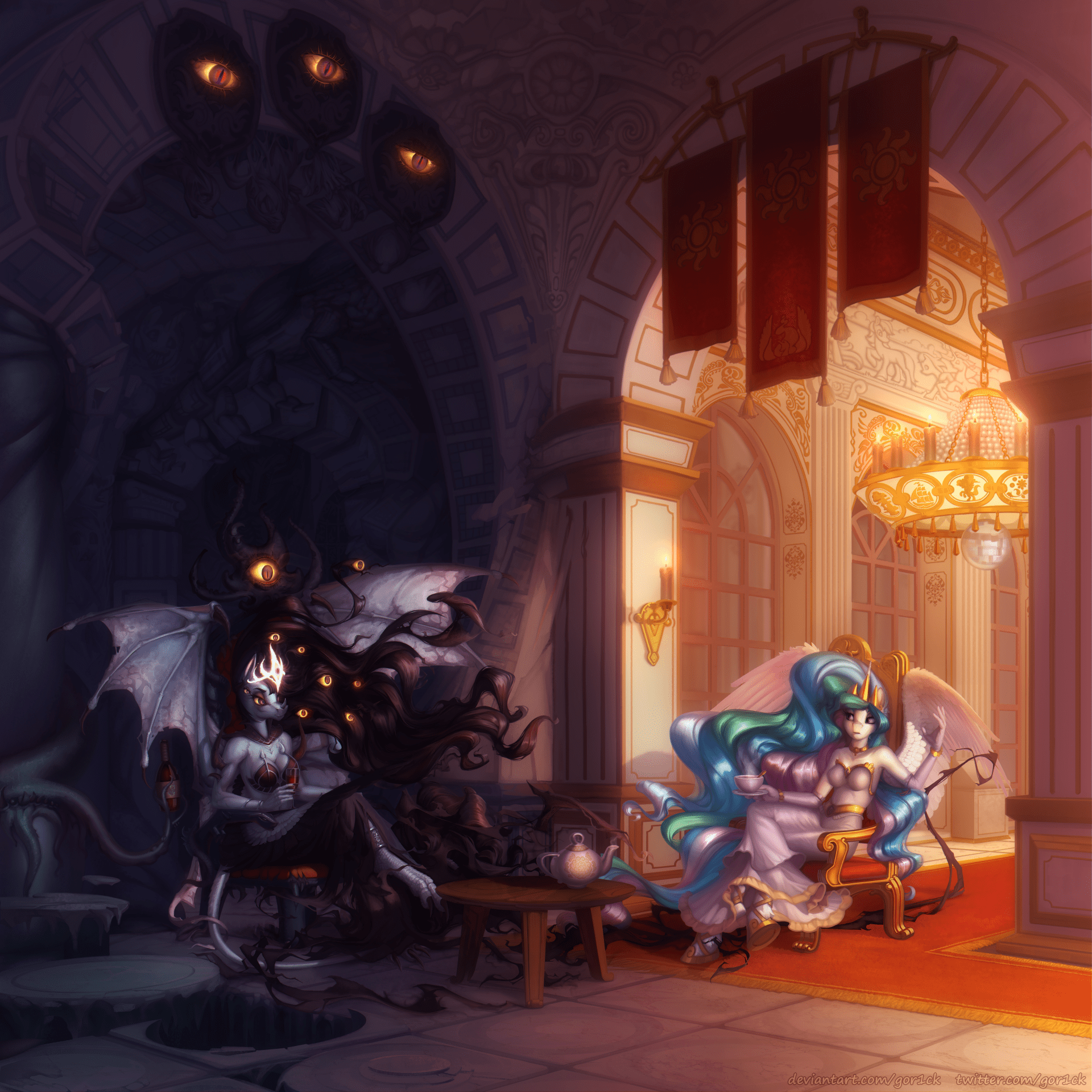 My most complicated commission work ever and most complicated digital work in last 10 years or so. I have no plans to paint anything like this again, but it's good in representation of what I can do. The quality tier is render, obviously. The site shrinked it, the full size is 5k x 5k and can be find in other places, for example, here: https://www.deviantart.com/gor1ck/art/commission-Conversation-1170517544