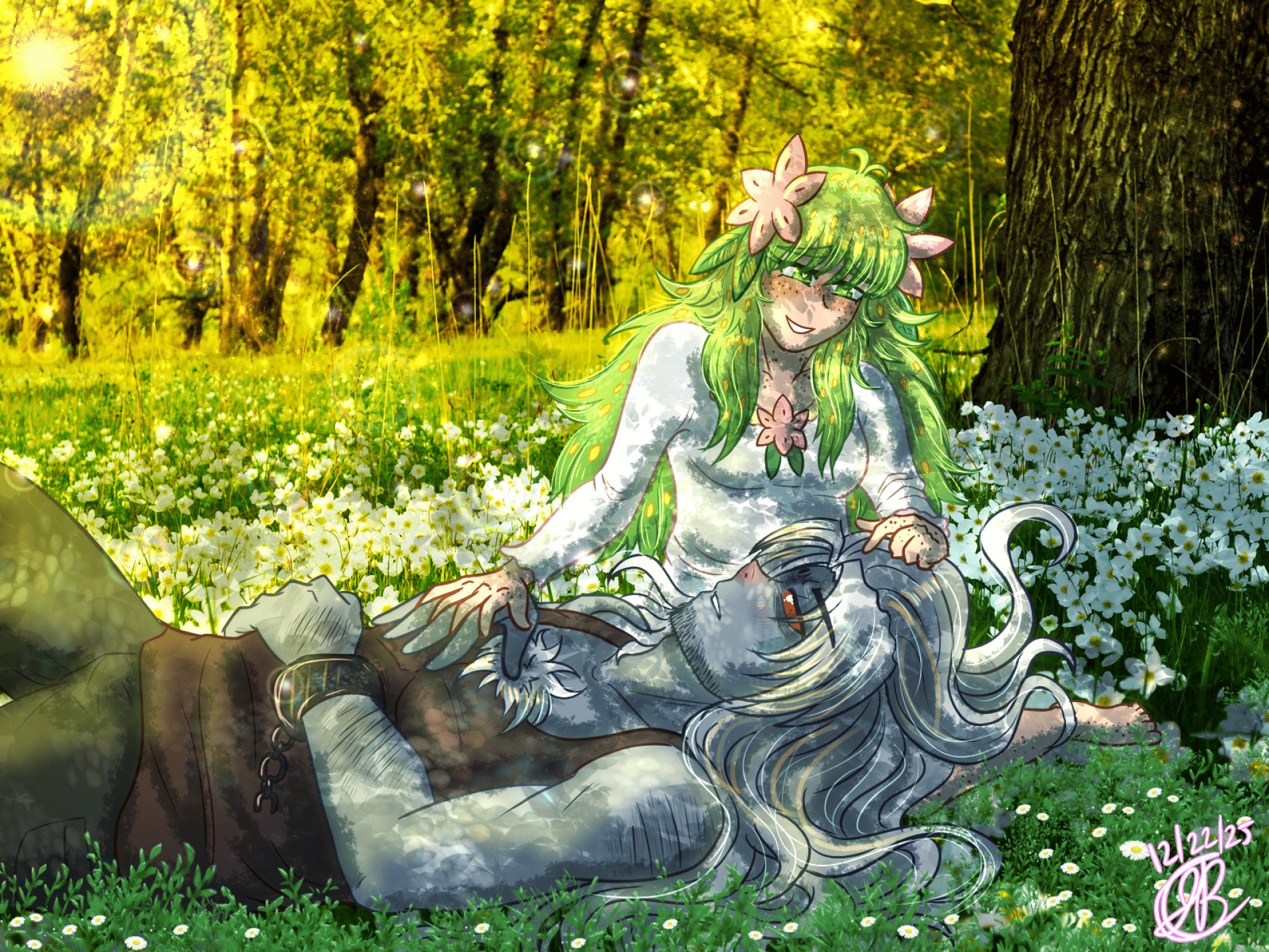 (Background image found on google when searching “free flower field background image”) When a Shaymin and an Annihilape fall in love… :”3